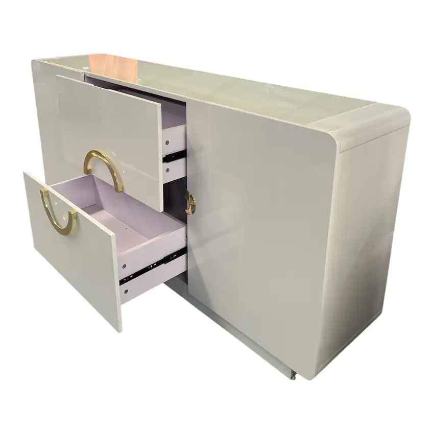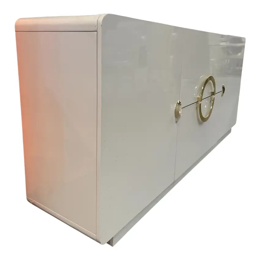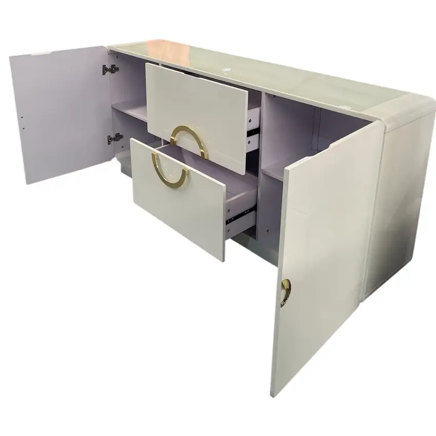 Aparador moderno branco com detalhes dourados, design sofisticado e amplo espaço de arrumação.