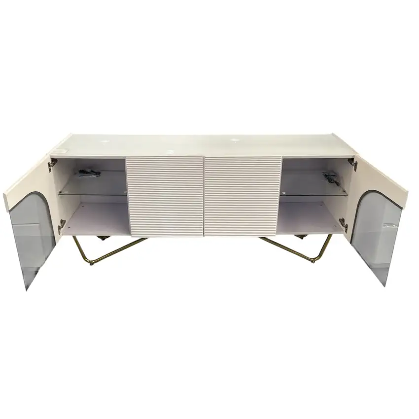 Aparador moderno branco com detalhes texturizados e pés dourados, ideal para decoração elegante e organização.