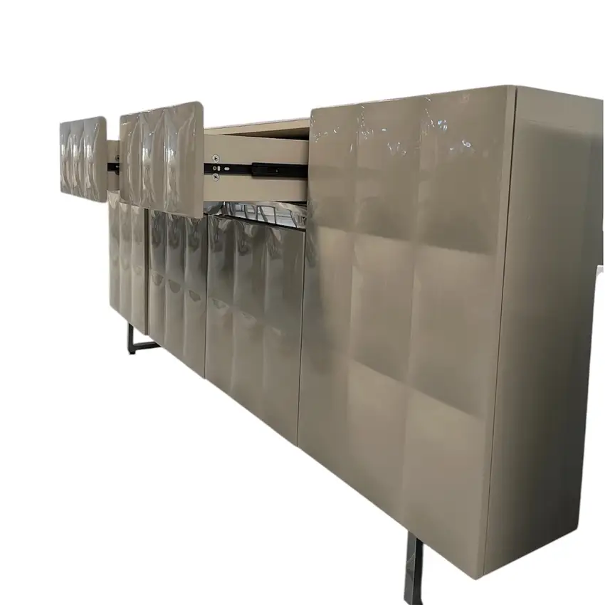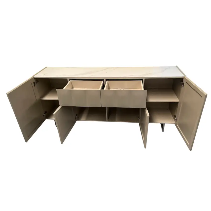 Eleve o patamar da sua sala de estar ou sala de jantar com este magnífico armário aparador, uma peça que combina na perfeição funcionalidade e um design vanguardista. Inspirado nas tendências mais recentes de mobiliário de luxo, este aparador é a escolha ideal para quem procura adicionar um toque de sofisticação e modernidade ao seu espaço. A sua superfície superior, com um acabamento que simula mármore de alta qualidade, não só confere uma elegância intemporal, como também oferece uma durabilidade excecional e facilidade de manutenção