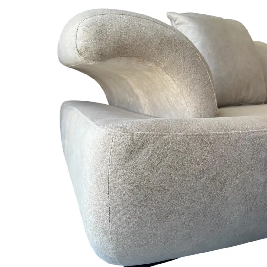 Sofá em formato L com design moderno e linhas curvas elegantes, ideal para salas sofisticadas e acolhedoras. Revestido em tecido de toque suave na cor bege/creme, oferece um visual clean que combina facilmente com diversos estilos de decoração. Possui assentos amplos e confortáveis, encostos macios e almofadas soltas que proporcionam maior comodidade para momentos de descanso e convívio.