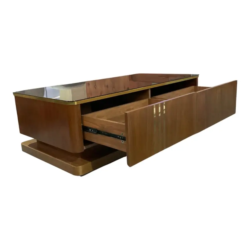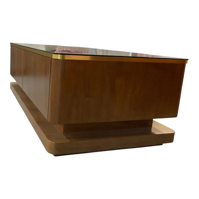 Aparador em madeira com tampo de vidro preto e detalhes dourados, elegante e funcional para ambientes modernos.
