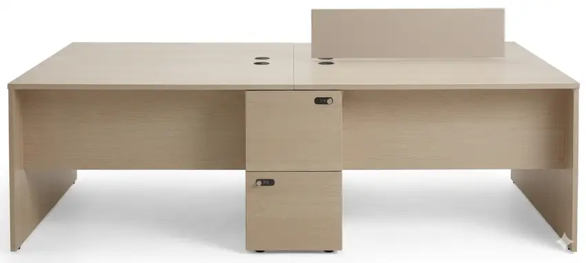 Mesa de escritório dupla com divisória, gavetas com chave e design moderno — ideal para ambientes profissionais.