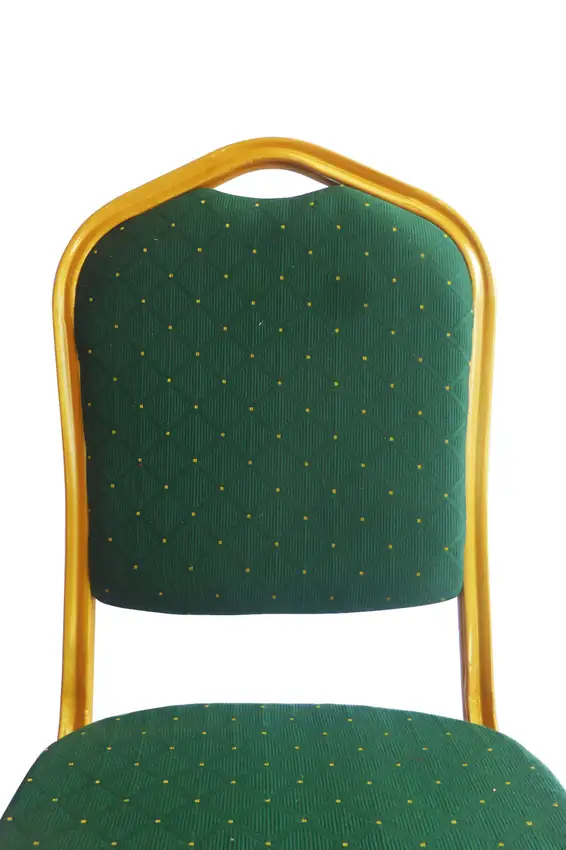 Cadeira estofada com design clássico e elegante, ideal para eventos, salas de conferência, restaurantes ou uso doméstico. Possui estrutura metálica resistente com acabamento dourado, combinando perfeitamente com o estofado em tecido verde com padrão discreto. O encosto levemente curvado e o assento acolchoado garantem conforto mesmo durante longos períodos de uso.