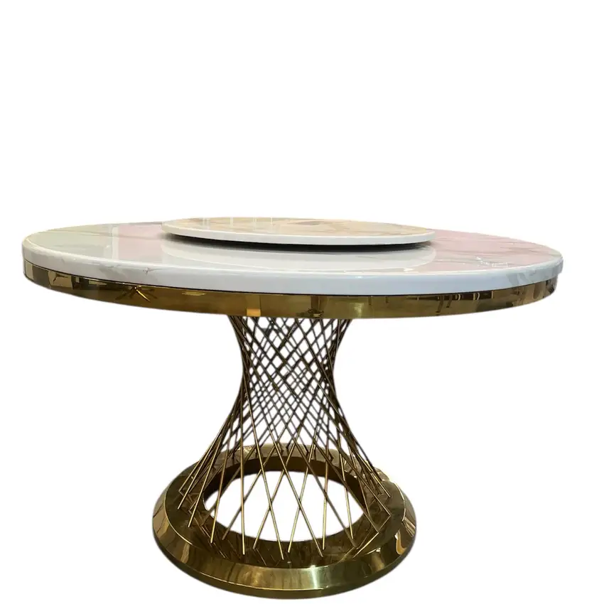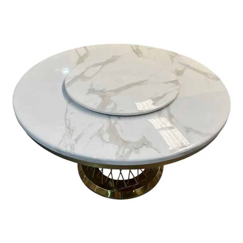 Mesa redonda marmorizada com base dourada e centro giratório, perfeita para refeições sofisticadas.