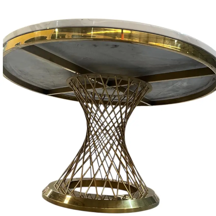 A base em metal dourado, com estrutura geométrica entrelaçada, confere estabilidade e um visual moderno e imponente. Ideal para reuniões familiares ou jantares especiais, esta mesa combina funcionalidade e estética premium em um único produto.