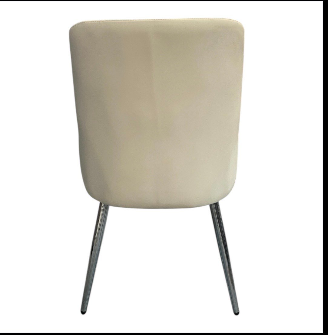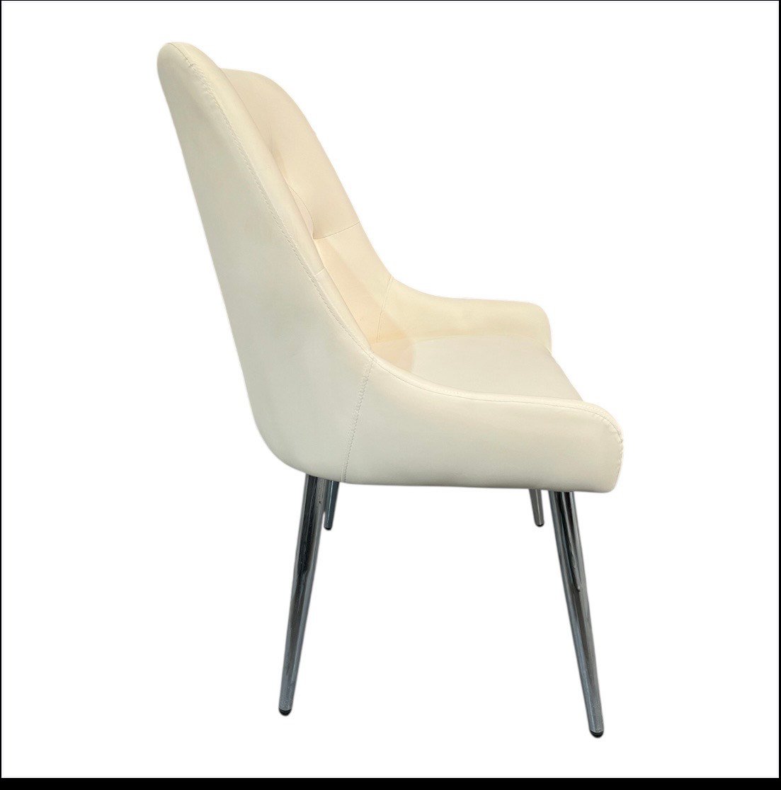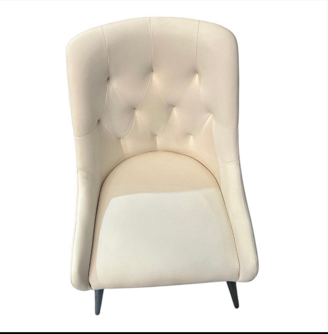Cadeira estofada bege com acabamento capitonê, confortável e elegante, com estrutura metálica resistente.