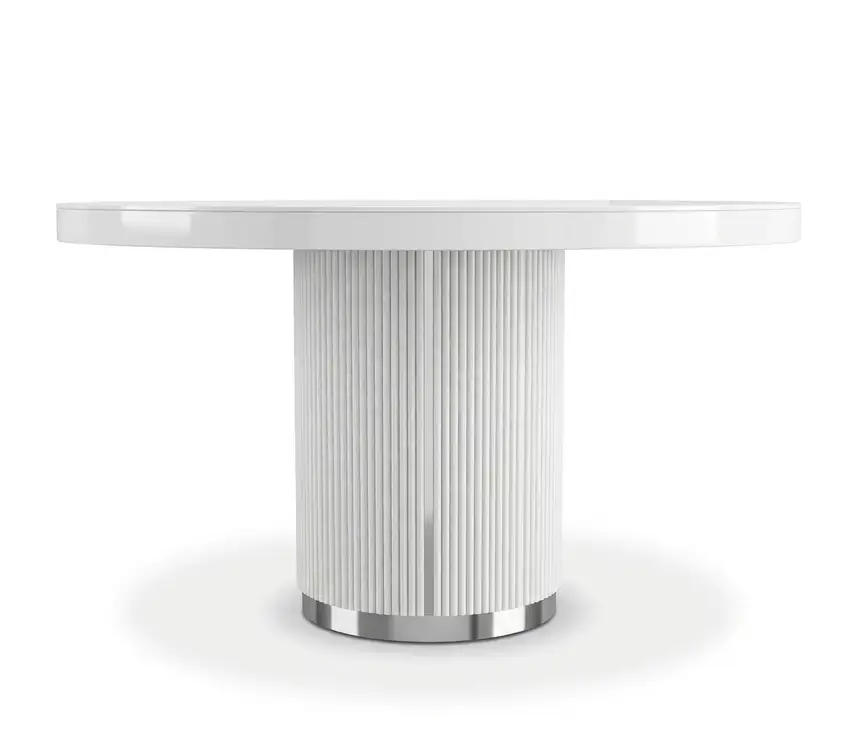 Mesa de jantar redonda branca com base canelada moderna e design elegante.