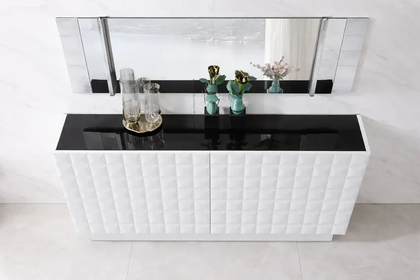 O Aparador Luxo Diamond White com Espelho é a escolha perfeita para quem deseja transformar o ambiente com elegância e sofisticação. Com acabamento branco e textura em relevo estilo “diamante”, este móvel destaca-se pelo design moderno e luxuoso. O tampo superior em preto cria um contraste refinado, ideal para exposição de peças decorativas. Acompanha um espelho amplo que amplia visualmente o espaço e traz ainda mais requinte ao ambiente. Ideal para salas de jantar, halls de entrada ou espaços contemporâneos.