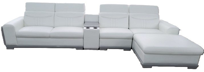 Sofá em L branco com chaise e console com porta-copos, ideal para ambientes modernos e confortáveis.