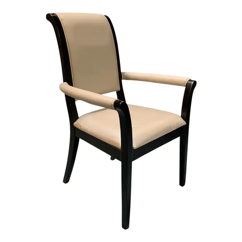 Cadeira com braços, estofada em bege, confortável e ideal para ambientes elegantes e profissionais.