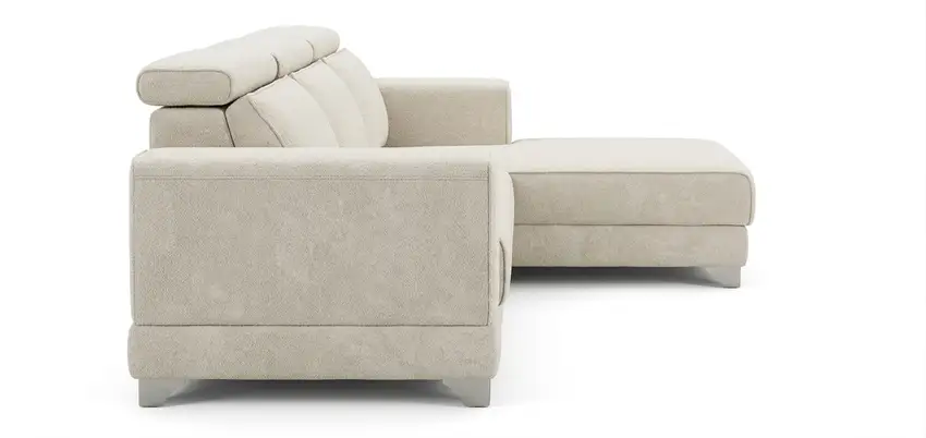Sofá em L bege com chaise, design moderno e conforto superior, perfeito para ambientes elegantes e funcionais.