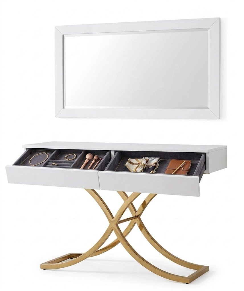 O Console Luxor Gold com Espelho é a perfeita união entre elegância e modernidade. Com tampo em acabamento branco sofisticado e base metálica dourada em design curvo e artístico, este móvel transforma qualquer ambiente com um toque de luxo. Acompanha um espelho de moldura branca que amplia o espaço e valoriza ainda mais a decoração. Ideal para halls de entrada, salas de estar ou quartos, oferecendo funcionalidade com gavetas discretas para organização.