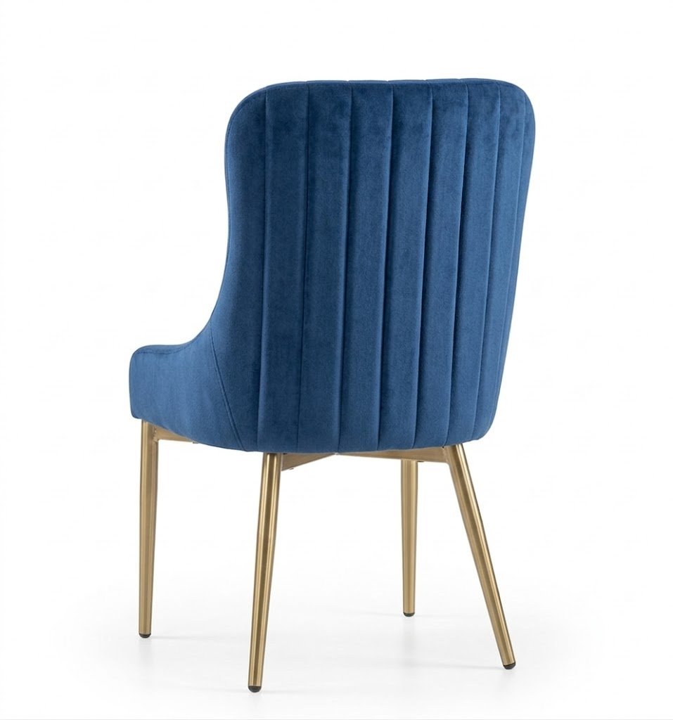 Cadeira moderna em veludo azul com pés dourados, ideal para ambientes elegantes e confortáveis.