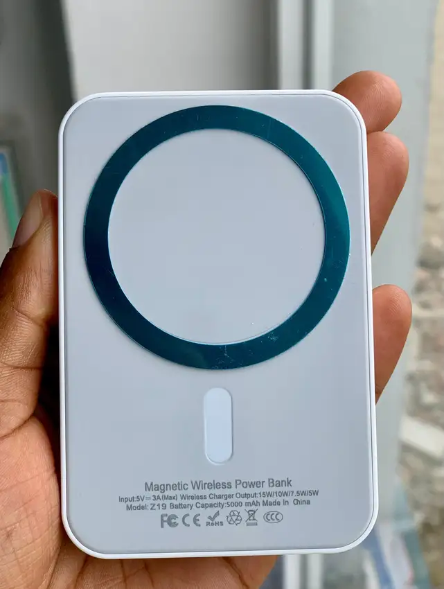 Power bank magnético com capacidade de 5000mAh, ideal para carregamento rápido e prático de dispositivos compatíveis com tecnologia MagSafe ou magnética. Compacto, leve e perfeito para o dia a dia.